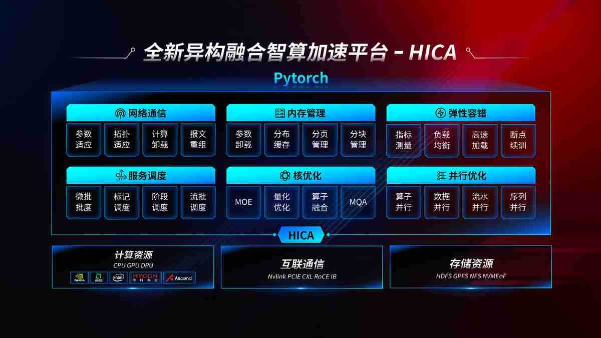 通过自研的服务层、、、中间适配层、、、、以及调度编排算法,,采用数据并行、、、模型并行等多种并行方式,,,把并行计算任务进行有效的分解,,使其分别由相应的软件栈和算力资源来承接。。当GPU资源变化,,,HICA可以实时动态调度计算子任务并调整模型拓扑和架构,,以充分聚合各种算力资源。。。。