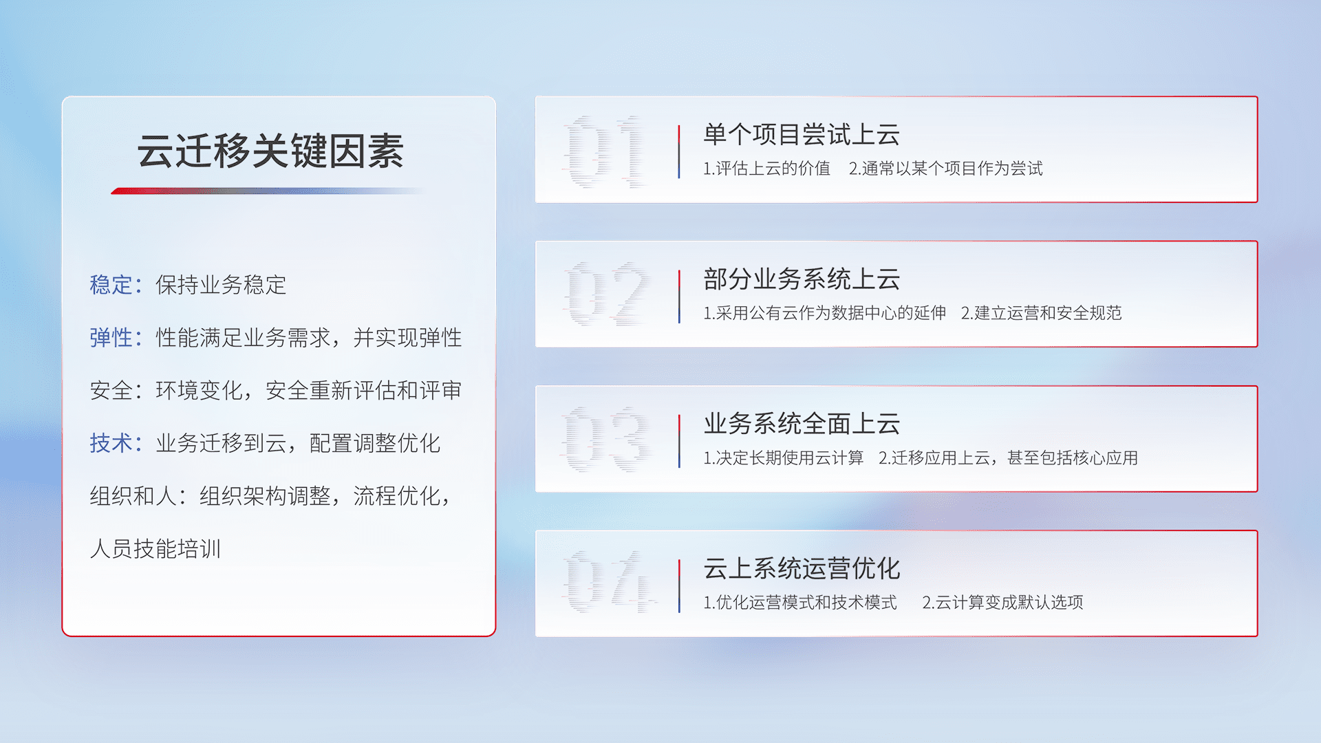 结合实际业务,,,,从规划设计、、云平台选型、、云原生改造、、、数据迁移、、、、集成交付,,,迁移全过程为客户识别最佳上云路径,,,做好风险识别管理,,,,设计网络架构、、、、身份权限、、、安全审计合规、、、操作审计、、、日志审计、、、监控告警策略、、、多站点容灾设计等,,,对云上基础设施进行整体规划,,,,提升IT治理水平,,,,以满足弹性、、、高可用、、高性能的需求。。。