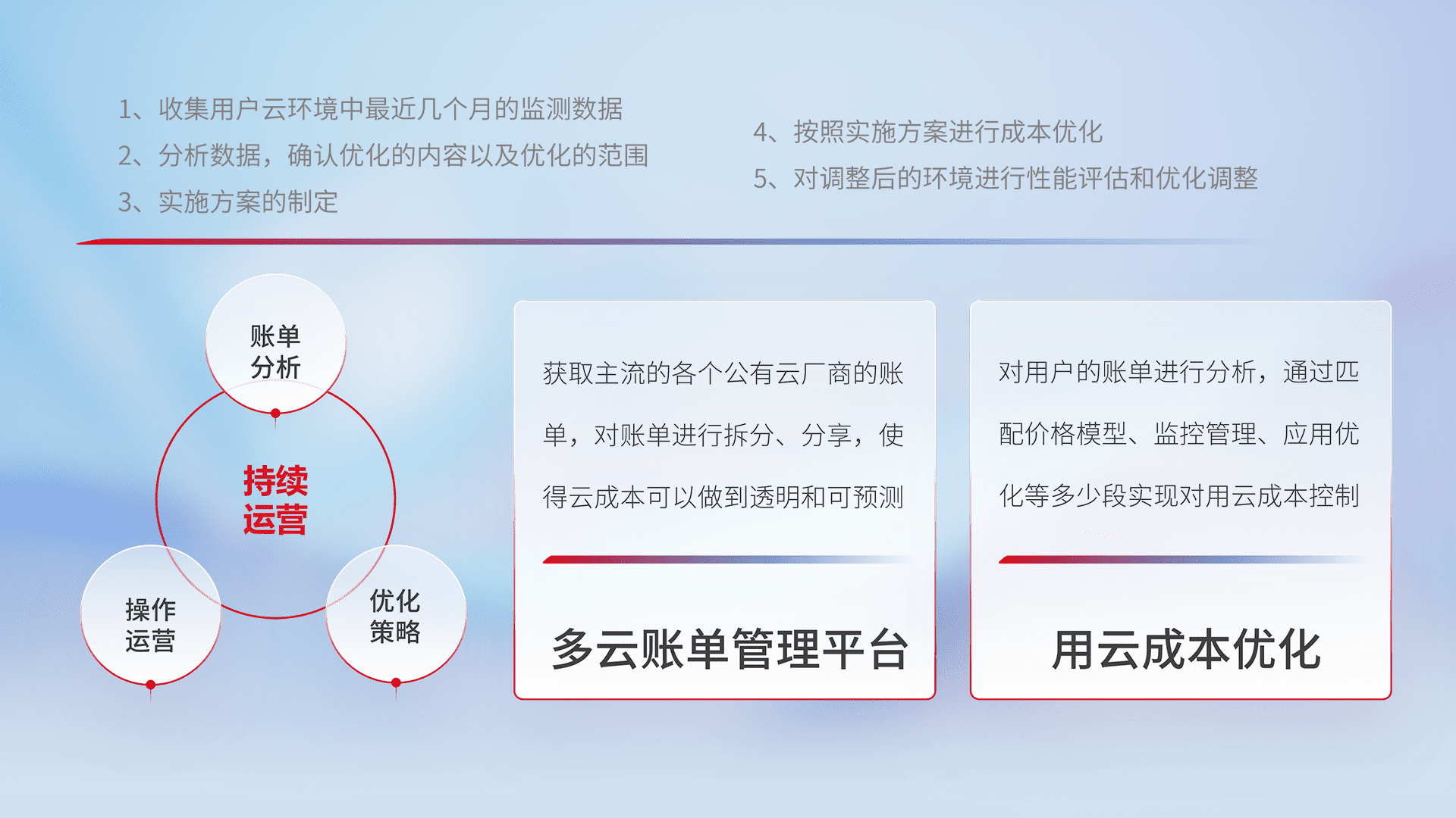通过多云纳管,,以统一的资源数据模型把客户的云资源进行抽象和封装,,,进而实现对多云资源的统一操作,,,保障云资源管理的可靠性、、稳定性与可用性。。。。量身定制化运维内容,,配置、、、、开发运维、、补丁管理、、、、备份、、监控、、认证和访问管理、、、、审计和日常巡检等,,保障在用云过程中的可靠度,,,稳定度以及高可用率。。
